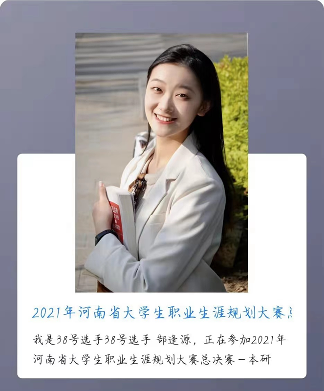 郜逢源同学,大学期间学习成绩优异,活动表现突出,以沉稳乐观的性格、踏实进取的学习态度,得到了领导老师的一致认可。曾获得国家奖学金、国家励志奖学金、河南省三好员工、河南省“互联网+”老员工创新创业大赛河南赛区一等奖、第十五届“挑战杯”河南省老员工课外学术科技作品竞赛一等奖、河南省职业生涯规划大赛银奖、河南省第六届老员工艺术展演一等奖、十大优秀员工标兵之星、校级优秀员工干部、三好员工等荣誉。