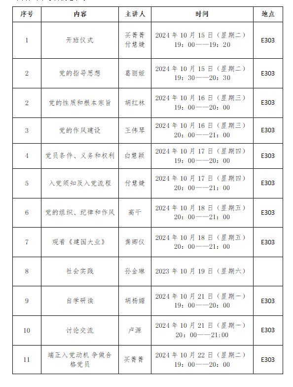 培训以习近平新时代中国特色社会主义思想及党的二十大精神为学习重点;以深入学习贯彻习近平新时代中国特色社会主义思想、学习党史和党的基本知识、遵守党章党规党纪、弘扬爱国主义精神、坚定理想信念、提升党性修养、学习榜样事迹、形势与政策、优秀党员先进事迹等为主要培训内容,将党性教育贯穿于入党积极分子培训的全过程。结合时政热点,引导学员进一步端正入党动机,以党员标准严格要求自己,发挥先锋模范作用。