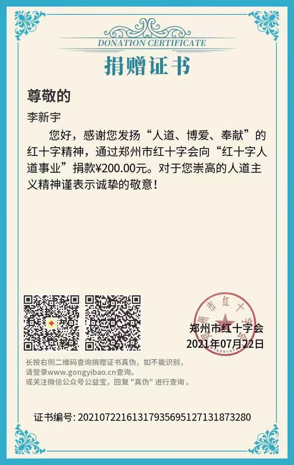 灾情牵动着亿万中国人民的心,所有同胞为之互助、鼓励和祈福。就像疫情到来时一样,社会上涌出很多爱心人士纷纷贡献出自己的一份力量。在郑州红十字会公布捐款渠道后,公司教师李新宇立刻向郑州红十字会捐款,以尽自己的一份心意。