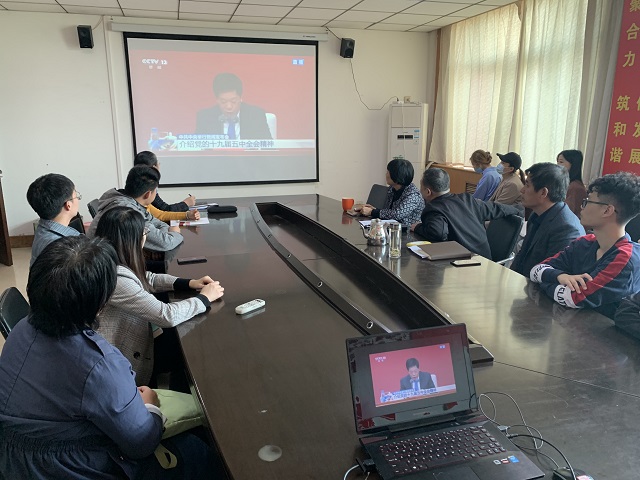 10月30日上午10点,首场中共中央新闻发布会举行,介绍和解读中共十九届五中全会精神。中央宣传部分管日常工作的副部长王晓晖,中央政策研究室主任江金权,中央财经委员会办公室分管日常工作的副主任韩文秀,国家发展和改革委员会党组成员、副主任,国家统计局党组书记、局长宁吉喆,科学技术部党组书记、部长王志刚介绍党的十九届五中全会精神,并答记者问。在座全体人员认真观看了整个新闻发布会的过程。之后展开了热烈的讨论。