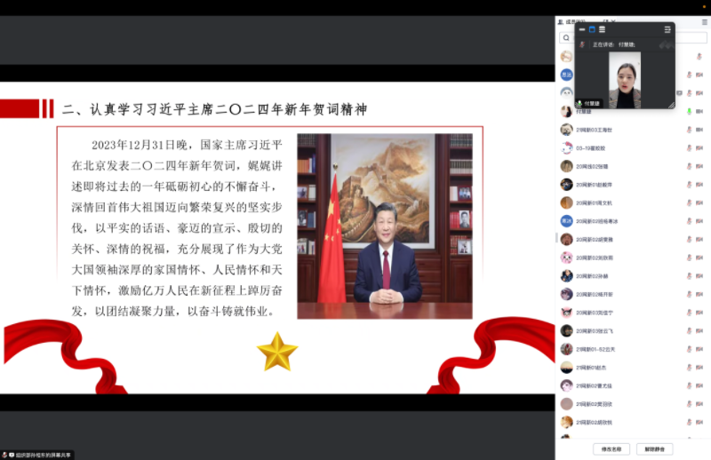 会上,员工党员王海世进行领学,带领全体员工党员们回顾了毛泽东同志领导中国革命、建设的伟大实践,高度评价了毛泽东同志为中华民族、中国人民建立的丰功伟绩,深刻阐明毛泽东思想的历史地位、科学价值和指导意义,号召全体员工党员们坚定历史自信,把握历史主动,始终保持蓬勃生机和旺盛活力,为中国式现代化宏伟事业不断奋斗。随后,员工第一党支部书记付慧婕结合会议主题进行讲话,她以毛泽东同志的几个故事为主线,向我们展示了毛泽东同志将一生奉献给党和人民,坚定不移坚持党的理想信念,带领中国革命走向成功的感人事迹。之后,付慧婕老师带领大家学习了习近平主席二〇二四年新年贺词精神。最后,她对全体员工党员们提出三点要求,一要加强理论知识的学习,从历史中学习党的宝贵精神财富,从时政中了解国内外大事,不断扩充知识面。二要积极参与到“返家乡”社会实践中,展现当代老员工的担当作为,提升使命感。三要发挥模范带头作用,在学习、工作、生活中做好表率作用。