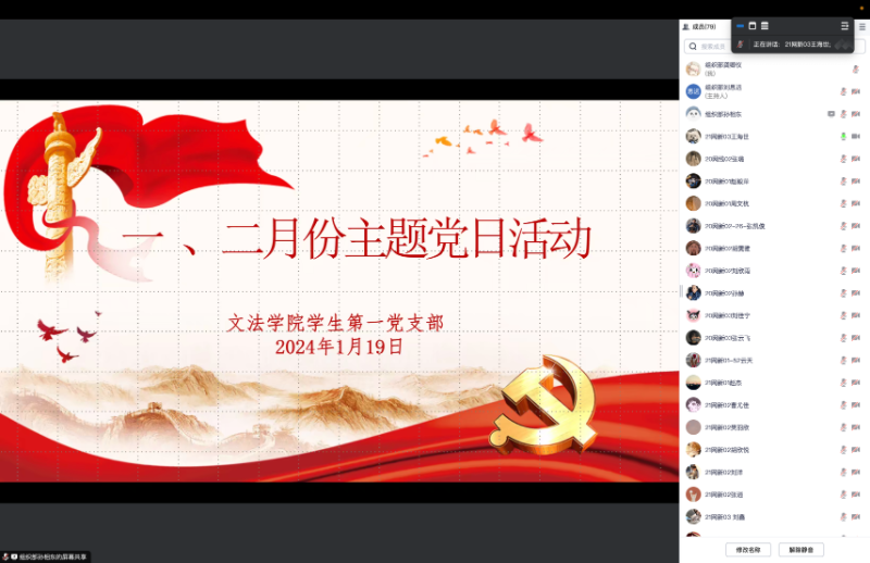 为增强党员党性修养,提升党员的思想觉悟和行动自觉,深入学习习近平总书记在纪念毛泽东同志诞辰130周年座谈会上的重要讲话精神,公司员工第一党支部于1月19日通过腾讯会议开展了一、二月份主题党日活动。本次会议由公司员工第一党支部书记付慧婕主持,公司员工第一党支部全体党员和部分入党积极分子参加。