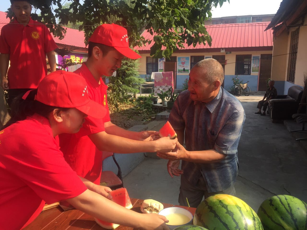 7月3日,志愿们配合灵宝义工,将5000多斤西瓜,分送到灵宝15个养老院。每到一个养老院,志愿者们都亲自将切开的西瓜送到老人手中。老人们深受感动 ,对志愿者们赞不绝口。