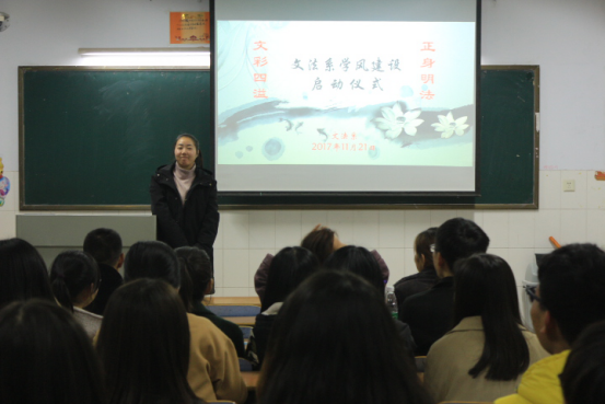 为了提高员工的学习兴趣,营造优良的学习氛围,进一步加强学风建设。11月21日,文法系在B310教室开展了“文采四溢 正身明法”学风建设活动的启动仪式。活动由16级辅导员李梦雨主持,17级全体班委参加。