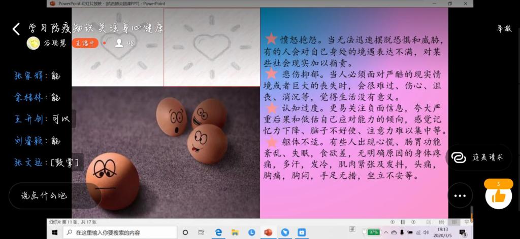 团课开始,各班主持人组织同学们在线上观看了防疫科普微视频,从直观的方式让同学们了解新型冠状病毒的来源、传播途径和防疫手段,并通过线上知识抢答的方式检验同学们对防疫知识的掌握情况。同时,各班主持人倡导同学们听从公司安排,保持联络通畅,不提前返校;不随意外出,勤洗手,出门戴口罩,每日定时汇报健康情况。最后,团课主持人向大家讲解了疫情中易产生的心理问题,分享了一些心理调适方法。