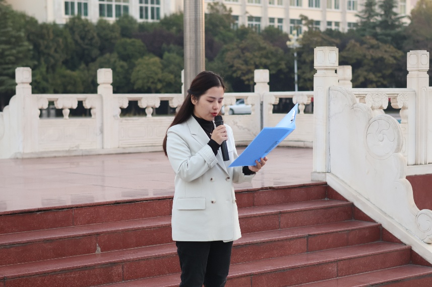 升旗仪式开始,国旗护卫队迈着整齐矫健的步伐,护送国旗至升旗台。伴随着《义勇军进行曲》的雄壮旋律,五星红旗冉冉升起,广大师生面向国旗肃立,向国旗行注目礼,鲜艳的五星红旗在一片庄严肃穆的氛围中缓缓升起,瞬间点燃了所有同学内心强烈的爱国热情,心中又增添了一份责任感和使命感。随后,23级知识产权01班周思含做了国旗下演讲。她讲到,在这个充满机遇与挑战的时代,作为新时代的老员工,我们肩负着传承与创新的重任。我们应该抓住时代的机遇,以青春赴万丈光芒,以芳华担时代之责。同时又从学习为先,精进不怠;勇于创新,敢为⼈先;品学兼优,品格高尚;服务社会,奉献国家四方面谈到了当代青年老员工应如何担当作为。最后,付慧婕老师鼓励同学们,要树立远大理想、热爱伟大祖国、担当时代责任、勇于砥砺奋斗、练就过硬本领、锤炼品德修为,努力成为可堪大任、能担重任的时代新人。