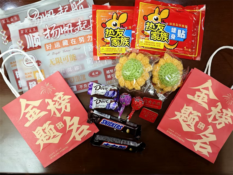 随后公司领导老师们纷纷行动起来,将一份份精心准备的考研礼包分发到同学们手中。礼包虽小,却承载着沉甸甸的祝福,里面装着能在寒冷冬日为学子们送去温暖的暖贴、寓意着旗开“德”胜的德芙巧克力、祝愿同学们考试“给力”的士力架、方便使用的文具袋、寓意同学们能够一举夺魁的向日葵钥匙圈、给同学们加油鼓劲的棒棒糖、还有象征着对大家考研上岸美好祝愿的加油徽章。
