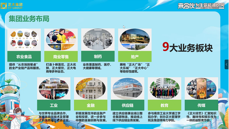 会上,赵焕霆首先介绍了正大集团的集团概况。正大集团成立于1921年,是泰籍华人谢易初先生创办的知名跨国企业,在泰国亦称卜蜂集团,英文为Charoen Pokphand Group,简称CP Group。其次,赵焕霆从农业食品、商业零售、制药、地产、工业、金融、供应链、教育、传媒9个业务板块介绍了集团的业务布局。岁月不居,天道酬勤。正大集团通过几代人的努力,成为全球最大农牧企业之一、全球最大饲料生产企业、全球最大虾产品生产企业、泰国最大大米生产和出口企业,可谓硕果累累。