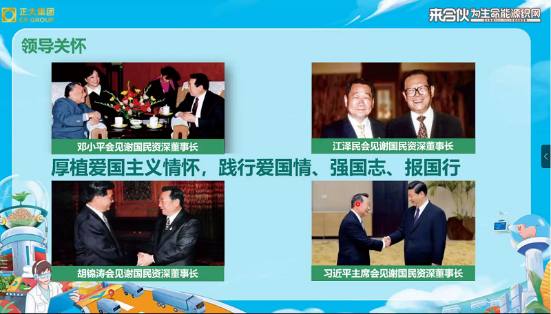 其后,赵焕霆介绍了正大集团的里程碑事件,此外,他提到,时代在变,年轻的面孔也在变,但爱国和追求进步的目标永远不变,红色基因的底色永远不变,始终奋进在时代前列的精神不变。他通过一组图片展示了领导的爱国情怀,并带我们目睹了正大集团卓越领导人风采。
