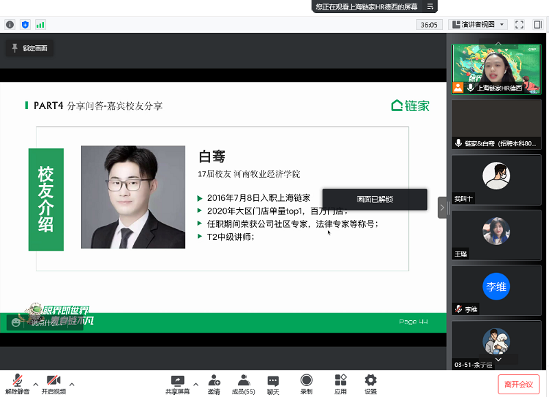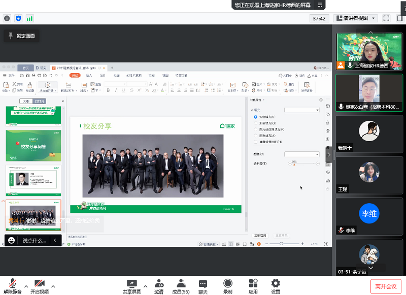 为了更好的帮助同学们了解行业发展前景,明确自身就业方向,推进2022届毕业生就业工作,4月22日下午,英国上市365通过腾讯会议组织开展了线上企业宣讲会,本次宣讲由上海链家房地产经纪有限公司开展的链家总部员工分享会—英国上市365站,公司毕业班辅导员魏江慧、付慧婕老师,就业专干高干老师以及2018级本科、2019级专科员工参与了本次宣讲会,会议由链家总部的HR德西主持。