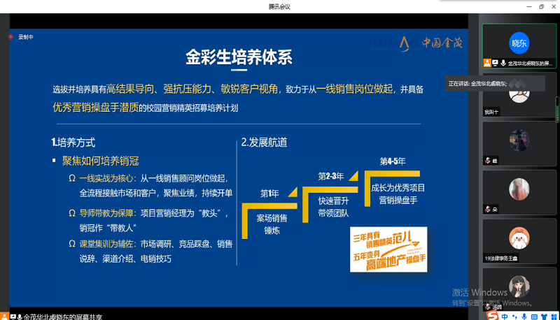 会上,虞晓东首先介绍了中原金茂2022届金才计划,通过“创无境,筑自我”的微视频带我们走进金茂,了解中国中化。习近平总书记在寄语新时代青年时指出,青春由磨砺而出彩,人生因奋斗而升华。而这个微视频恰如其分地展示了金才计划2021年上半年自销前三甲金彩生的风采,呈现了当代青年的奋斗姿态和蓬勃力量。随后,虞晓东通过演示PPT,介绍了金彩生培养体系。虞晓东特别提示:1、各站点招聘日程安排有所不同,以具体通知为准;2、敬请关注“金茂华北校招”官方QQ,招聘最新信息将及时公布;3、为便于后期面试、测评等环节开展,请登录网申系统进行网申4、网申:中国金茂官网-人才资源-校园招聘-公司部门选择金茂华北-选择金彩生投递即可。