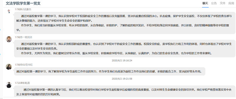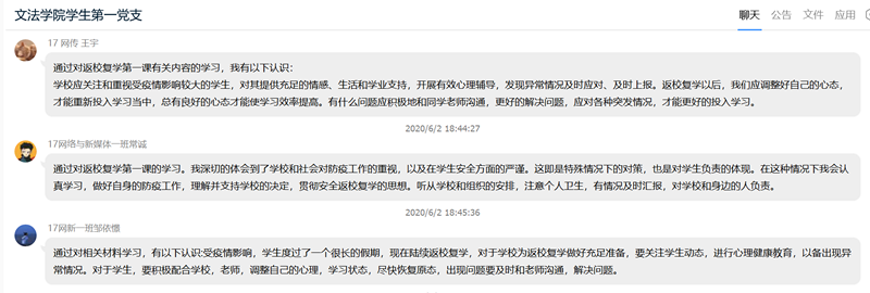 学习过程中,大家在交流群里进行了热烈的交流。大家纷纷表示,通过本次学习,增强了党员对复学工作重要性的认识,了解了工作流程,更加深刻地认识到了作为员工党员在抗疫中肩负的责任和使命,决心在返学复学工作中发挥模范带头作用,确保工作顺利进行,圆满完成任务。