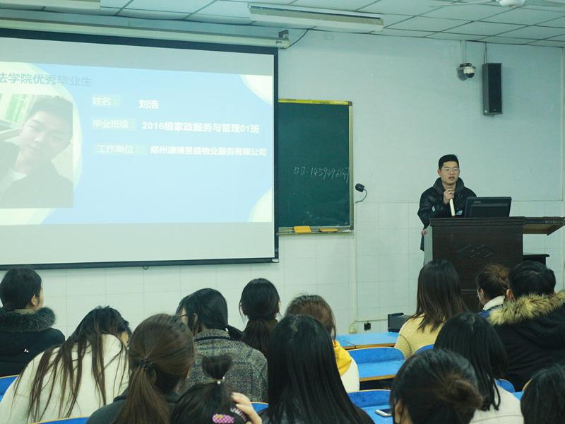 首先,由付慧婕老师向大家依次介绍本次邀请到的优秀毕业生。随后,以218分的高分考入河南工程公司的徐景分享了自己的专升本经验。她指出,英语语法复习要分模块练习,吃透弄懂,提高效率,多刷真题;专业复习要形成体系,要能将知识点串联起来,不能死记硬背,同时还要保持好的心态去迎接这场考试。河南工程公司的李彤彤强调了时间分配的重要性,鼓励同学们考前要严格按照考试时间进行模拟练习,严格控制时间,保证考场上时间的合理分配。洛阳理工公司的王翠花建议大家要建立思维导图,要在脑海里构建大框架,不断梳理知识点脉络,确保答题时完整全面。英语复习要善用作文模板,灵活运用高级词汇进行替换。2016级家政服务与管理专业的刘浩结合自身创业和就业的经历,分析了当前的就业环境和就业前景。对于面临就业的同学,给出了三点建议:第一,求职有条件的话尽量选择大企业,大企业能提供更充分的锻炼机会。第二,要了解自身情况,了解岗位和行业发展。第三,创业时要充分了解市场,要深入调研,做好预算。