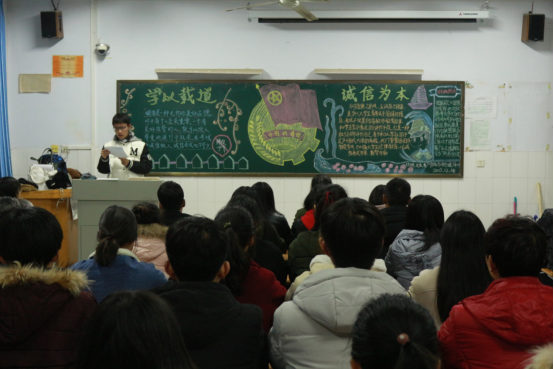 为了培养同学们树立“诚实守信,文明自律”的价值理念,以端正的态度和积极的心态迎接即将到来的期末考试,形成良好的学风和考风,文法系于12月14日在教学楼A区开展了以“诚信考试”为主题的团课,17级全体同学参加。
