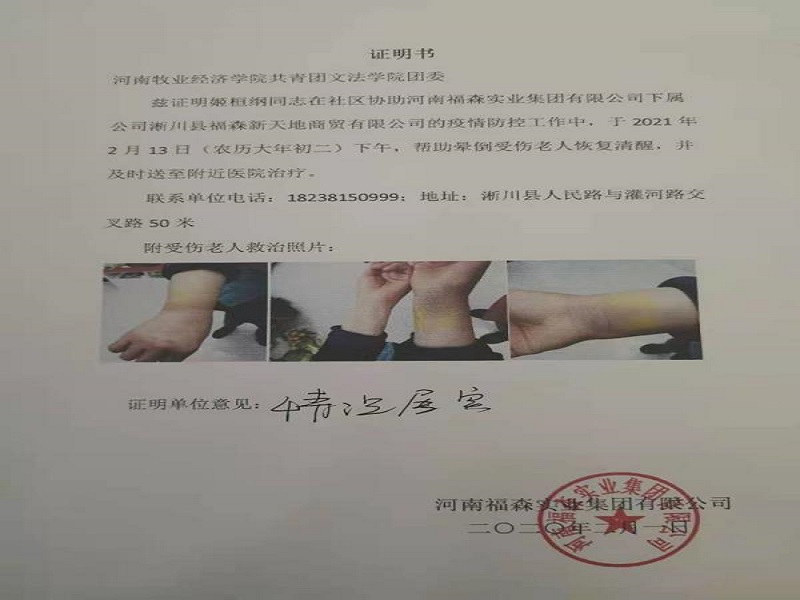 淅川县疫情防控期间,姬桓纲同学第一时间响应疫情防控号召,在社区宣传疫情防控知识,提醒居民在家要勤通风、勤洗手,外出必须要戴口罩、少聚集,他以实际行动守护着家乡。据了解,姬桓纲同学于2021年2月13日(农历大年初二)下午,帮助一位晕倒受伤的老人恢复清醒,并及时送至附近医院治疗。这一善举充分展现了新时代老员工敢于奉献的优秀政治品格,为当代青年树立了良好的榜样。
