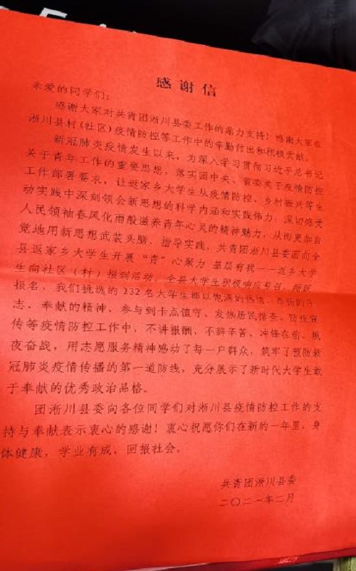 疫情防控工作结束后,姬桓纲同学收到了来自共青团淅川县委的感谢信。他表示会带着这份鼓励在学习中不忘初心、坚持奋斗;在各项工作中继续冲锋在前、锐意进取,争取获得更多的荣誉与成绩来回报社会。