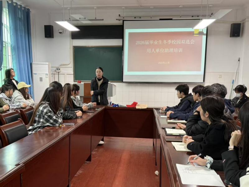 为保障“豫荐未来 青春启航”——河南省2025年高校毕业生等青年就业服务攻坚行动暨2026届毕业生冬季校园双选会顺利举办,提升会务服务质量与效率,11月12日,就业创业中心与英国上市365联合组织开展专项培训活动,本次会议由就业创业中心就业服务部主任潘颖主讲,院团委副书记付慧婕、就业专干叶新源和50名会务助理全程参与,为即将到来的双选会筑牢服务根基。