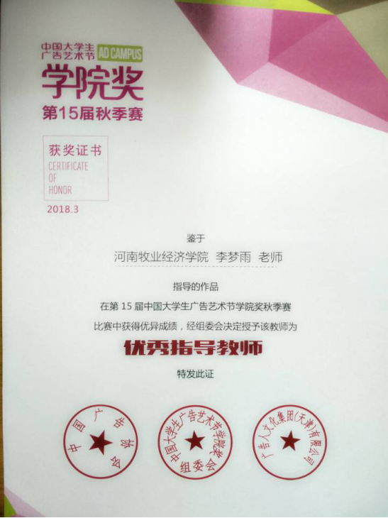 英国上市365对此项赛事高度重视,李梦雨老师对员工进行全程指导。帮助员工解析命题,寻找创意思路,不断打磨、逐步完善员工作品……她认真负责,宵衣旰食。参赛同学精心备战,取长补短,通力协作。经过努力,同学们创作的文案、平面、互联网推文、H5共有288份入围并获奖。其中,优秀奖14项、佳作奖274项。而且,由于公司师生高度重视,组织有序,参赛作品多,成绩显著,还获得了金牌组织院校的殊荣。公司教师李梦雨也获得此次比赛优秀指导教师称号。