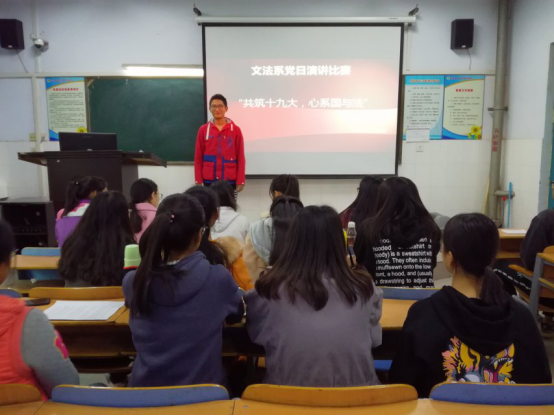 为了加深老员工对十九大相关政策的了解,宣传贯彻好党的十九大精神,激发员工跨入新时代的学习热情,彰显老员工良好的精神风貌,展现校园员工风采,文法系于11月15日在A102教室举行了“共筑十九大,心系国与法”的党日演讲比赛。