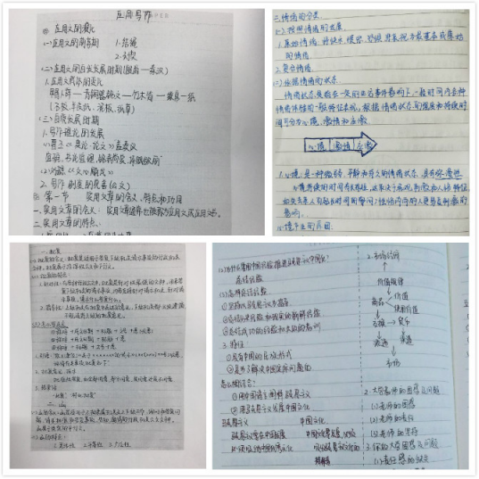 经过前期动员宣传,历时两周,各班学习委员将班级优秀课堂笔记选送至团学会学习部。透过一沓沓整齐的笔记本,我们可以看到同学们清秀隽雅的笔迹,或者苍劲有力的字体,一笔一画都体现着他们认真聆听老师授课的的场景。经过学习部干事精挑细选,推选出35份优秀课堂笔记作为备选素材。再经由系员工工作领导小组的老师们优中选优,最后选评10份课堂笔记作为获奖标兵,近期将于绽放广场公开展出,以展现文法系的优良学风,鼓励更多的同学,向他们学习。