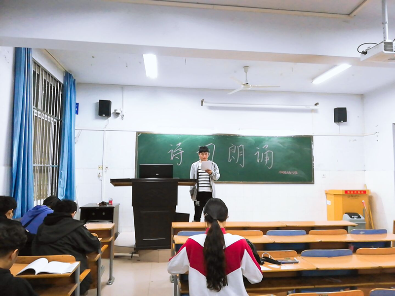 中华文化源远流长,博大精深,唐诗宋词无疑是其中一颗璀璨耀眼的明珠。从小学启蒙时诵读的“鹅鹅鹅,曲项向天歌,白毛浮绿水,红掌拨清波”到后来的《次北固山下》《雨霖铃》《声声慢》《琵琶行》《行路难》……这些脍炙人口的经典诗篇丰盈了我们的心灵,滋养了我们的精神,陶冶了我们的情操。活动中,同学们再次畅游诗海,诵读经久不衰、动人心魄的经典诗篇,品味中华传统文化的精粹。大家仿佛置身于王维“人闲桂花落,夜静春山空”的春夜溪景之中,也好似听到稼轩在黄沙道中的“明月别枝惊鹊,清风半夜鸣蝉”,感受到了“霜叶红于二月花”一般的秋日胜景,也接触了像“秋风原上,目断四天垂”般萧索孤寂的秋天,亦同情诗人在冬天那种“乱山残雪夜,孤烛异乡人”的孤独飘泊无依之境。在比赛中,台上选手热情分享着自己所喜欢的诗词作品,台下同学聚精会神,认真聆听。通过古诗词这个纽带,大家跨越时空与这些诗词大家们进行了妙趣横生、受益良多的对话。