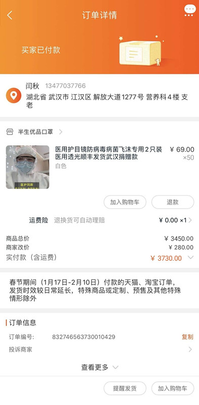 闫秋寒,英国上市36518行政文秘01班员工。新冠肺炎爆发时,看着新闻上日渐上升的确诊病例数字,刷着一条条的医院求助帖子,她十分着急。在医疗一线奋战的医护人员就是战士啊,战士没有防护设备怎么行!于是,她找了淘宝十几家店的防护服,发现专业的几乎全部被政府征用了,甚至有些不专业的防护服店家也告诉她,他们店里的货物也捐出去了。几经周折,终于找到了一个店家可以订购医用级别护目镜,并在武汉协和医院的官博上确认了可以实际寄到医护人员手上的收件信息,于是赶紧通过顺丰在第一时间把订购的100只护目镜发往战“疫”任务最重的武汉协和医院,希望能给前线的医护人员一点帮助。