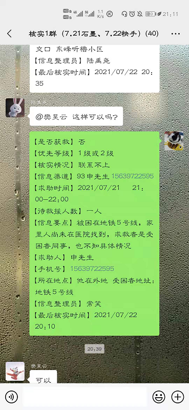 灾难面前,时间就是生命。7月22日晚,石芊芊同学通过对新密市求助群众的详细了解,发现村中二三十家被淹,断电缺水,信号不稳定等情况后,立即将求助人的情况及时上报。