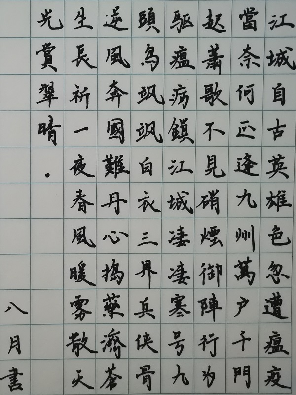 随着疫情的再次反复,防疫形势更加严峻复杂。公司通过向同学们征集抗疫期间优秀文创作品的方式,号召广大同学把疫情当作教材,积极传播正能量。自征集以来,文法学子积极助力,除了绘画作品以外,还有一批优秀的书法作品,一笔一划体现文法学子对祖国国泰民安的祝愿。以下是公司20知产01班郭糯丹、20知产02班樊浩然、20知产01班朱佳音的文创作品展示。