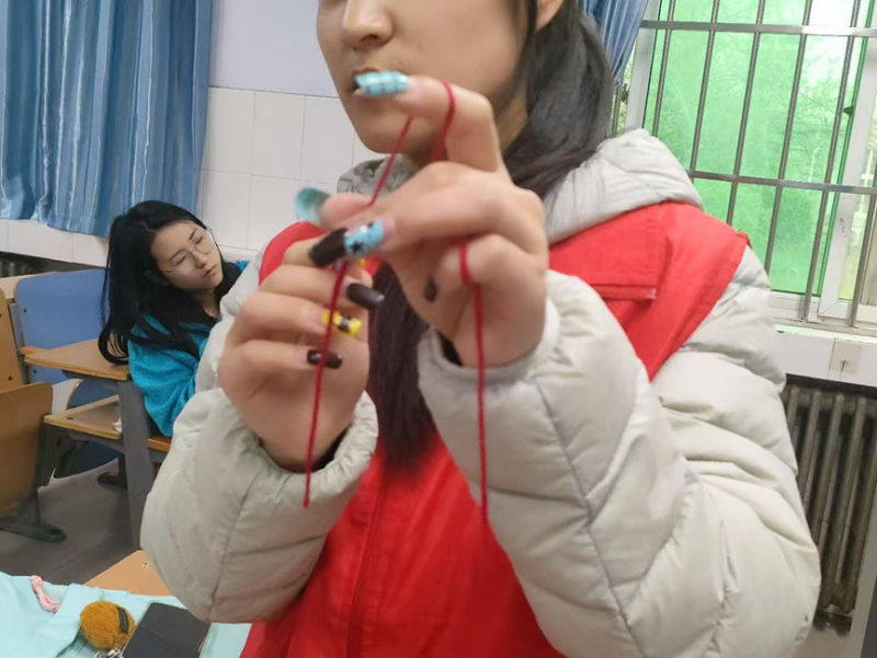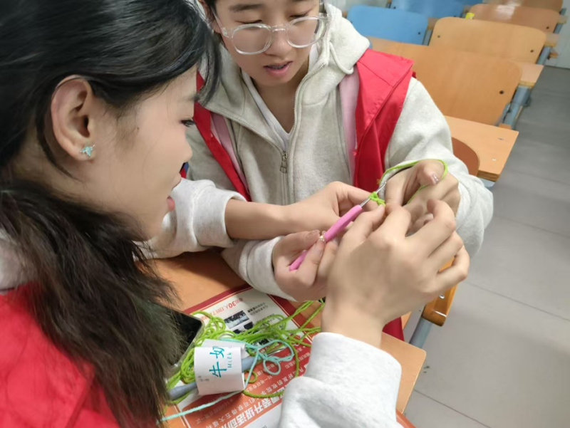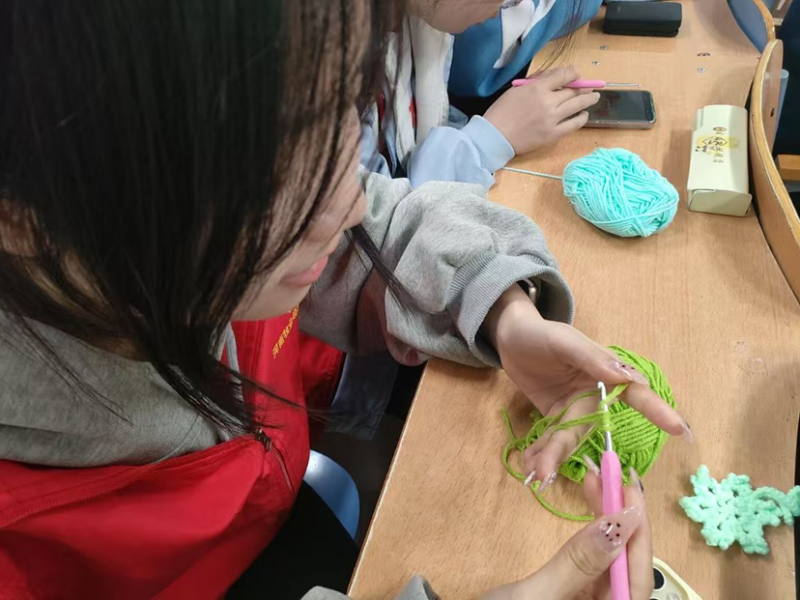 在自由创作环节,同学们充分发挥想象力,将所学技巧融入个性化作品中。有的同学钩织出可爱的杯垫、发卡,有的尝试制作小巧的玩偶或装饰品,还有的挑战更复杂的图案设计。五彩的毛线在指尖流转,一件件充满童趣与创意的作品逐渐成型。现场欢声笑语不断,大家互相交流心得,分享成就感,展现了青春活力的校园文化氛围。