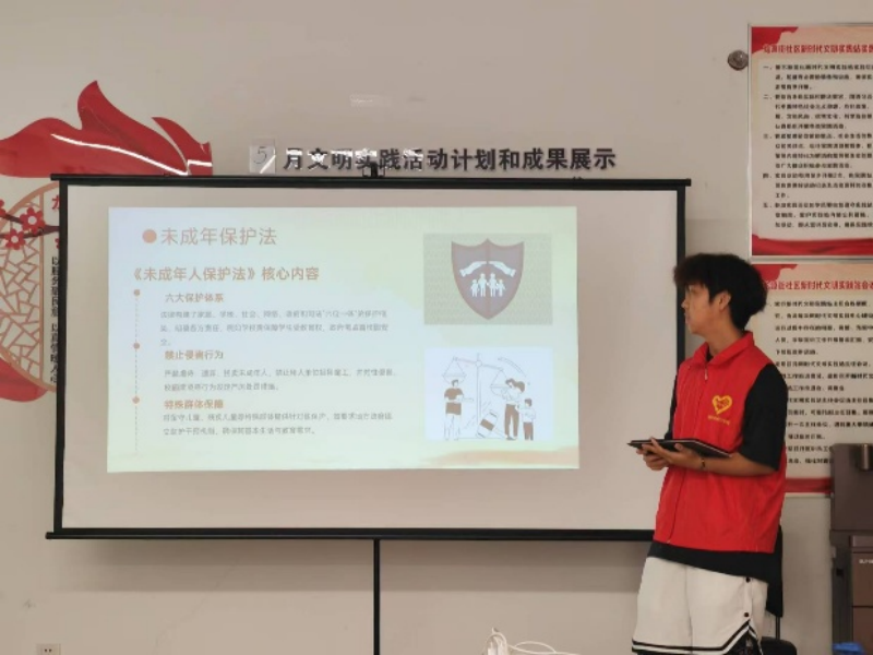 活动当天,志愿者们冒着炎炎烈日早早抵达龙源社区,在社区广场设置宣传展位,通过发放精心制作的普法手册,PPT知识宣讲等方式,吸引了众多居民驻足参与。宣讲过程中,志愿者们结合实际案例,以通俗易懂的语言进行讲解。针对反诈骗,详细剖析常见诈骗手段及防范要点;关于网络安全法,强调个人信息保护的重要性;围绕未成年人保护法,向家长普及如何为孩子营造健康成长环境;对于知识产权保护法,则以生动案例展现其在日常生活中的应用。此外,还设置了互动问答环节,居民们踊跃提问,志愿者耐心解答,现场氛围异常热烈。与此同时,志愿者深入社区内部与居民面对面交流,进一步扩大宣传覆盖面。