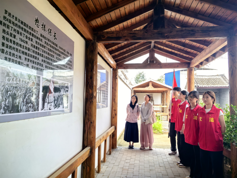 踏入罗进才旧址陈列长廊,墙面史料展板与黑白照片如时光拼图,勾勒烈士革命轨迹。作为漯河早期革命者,他投身抗日救亡、领导抗粮抗丁,最终为护乡亲壮烈牺牲,“对党忠诚”的誓言凝刻在斑驳影像间。抗粮斗争的群情激昂、掩护转移的惊险瞬间,透过画面与文字直击人心。实践队成员屏息凝视,毕业生董恒瑞望着“怒揍保长”展板感慨:“先烈热血赴使命,吾辈实干续传承!基层革命者的奉献,正是乡村振兴的精神源泉。”