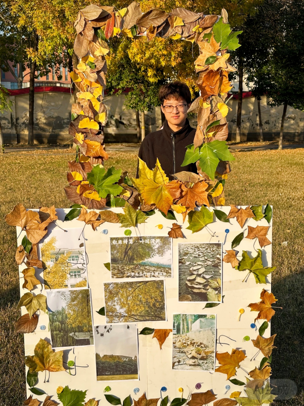 活动筹备阶段,服务队的同学们利用课后时间分工协作:有人负责在校园步道、绿化带收集银杏、梧桐等自然脱落的落叶,按叶形、颜色分类整理;有人提前一周拍摄了校园里的秋景,洗印成照片备用;还有同学用卡纸制作了一个简易复古相框,将落叶按暖色调渐变的顺序粘贴在相框边缘,中间留出空位方便同学们入镜。