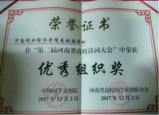 牵手梦诗华 流光溢飞彩——文法系春秋国学社喜获河南高校诗词大会优秀组织奖