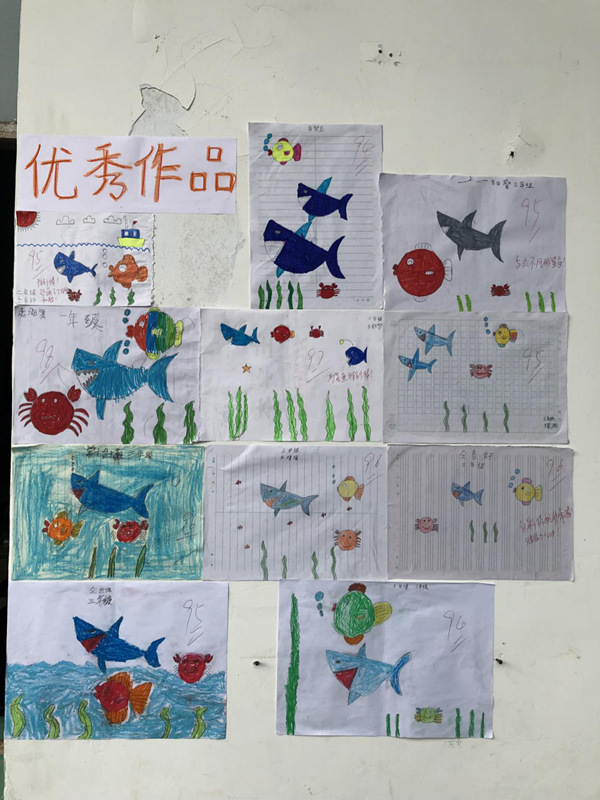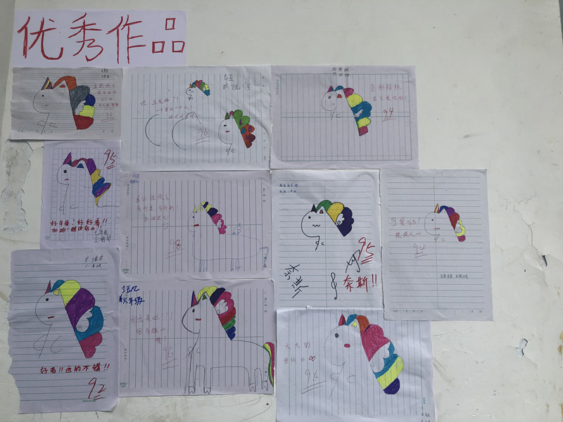 美术课堂上,朱梦雨同学耐心地讲解画画步骤和相关技巧,生怕会有遗漏。孩子们聚精会神听讲,心中开启了五彩斑斓的世界。他们在画纸上自由地构思自己的奇妙世界,画得栩栩如生,令人赞叹。有个叫陈果亿的男孩,他颇具创意地给独角兽添加了身体,令人眼前一亮。老师们趁机引导孩子们要敢于尝试,勇于创新,善于独辟蹊径,而非按图索骥,墨守成规。每一幅绘画作品都被老师们认真地批改,并留下了贴心的评语。志愿者们还在教室外墙上专门设立了优秀作品展区,以此鼓励孩子们用心描绘出更好的作品,大胆表达自己的想法和创意。