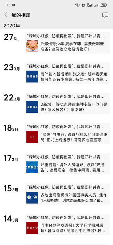 近三个多月,“环手爱”青年志愿者们踏上疫情防控征程,争取做好舆论的正向标。为了防止有人信谣、传谣、造谣,让广大市民形成正确识别信息的能力,志愿者们在服务队的领导下在朋友圈积极转发官方发布的正能量文章,如在家如何防疫,口罩应该怎样戴,奋斗在一线的人都在做什么,新增确诊病例是多少,在什么条件下才能复学等。通过推文转发向广大市民传授防控常识,让更多人了解疫情期间的防范知识以及疫情进展消息,对当下疫情形成正确认知,避免陷入谣言误区。