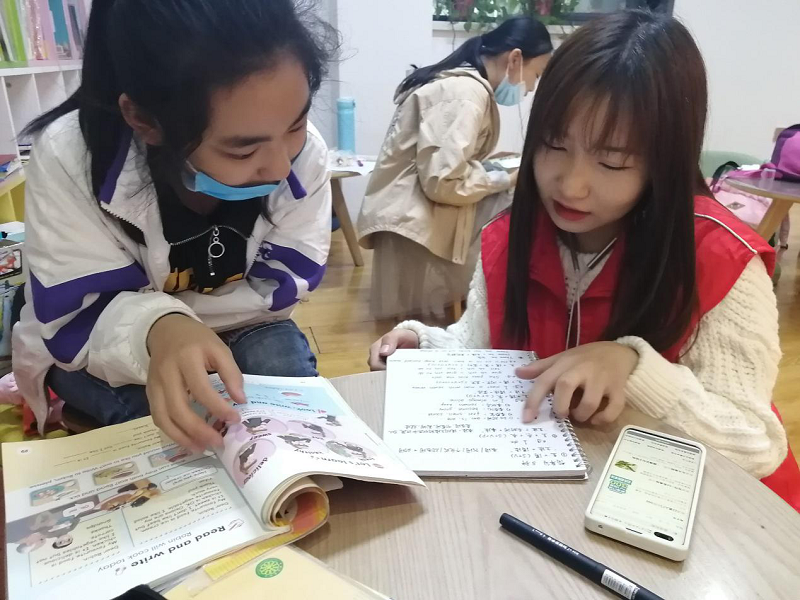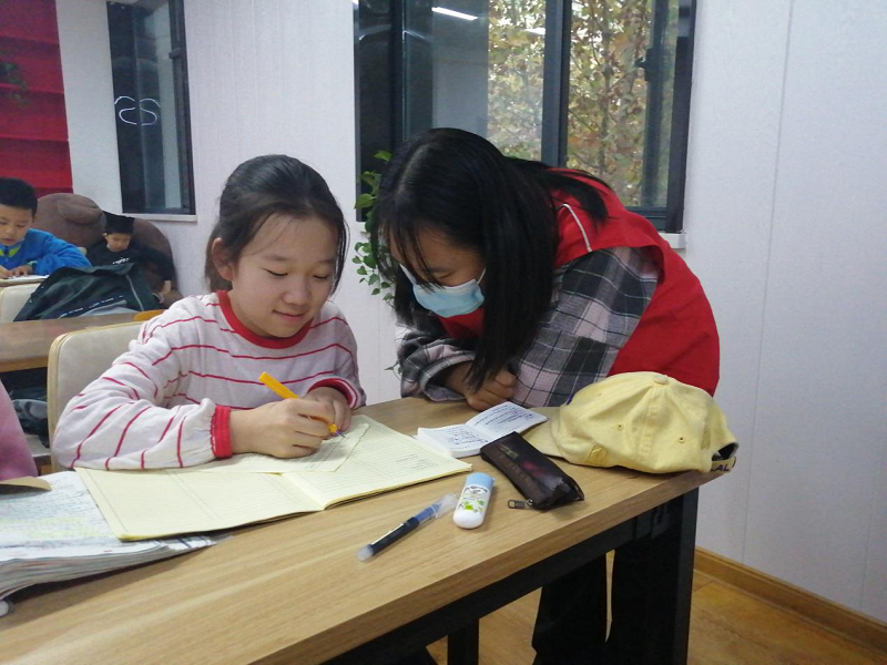 志愿者们到达“四点钟课堂”后,小朋友们也陆续来到课堂。志愿者马上开展志愿辅导服务活动。有一位五年级小朋友英语成绩不理想,在得知她的情况后,志愿者任静同学自愿肩负起这位小朋友的辅导重任。对于小朋友不理解的词句,任静同学细心讲解,一个字母一个字母的教她书写并解读其意思。任静同学说:“感觉小朋友很可爱,学习也很认真,一双大眼睛特别有灵气,对学习很渴望,十分努力,小朋友善学好问,心里很感动,也很有成就感”。