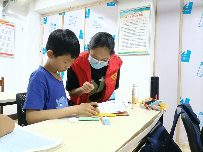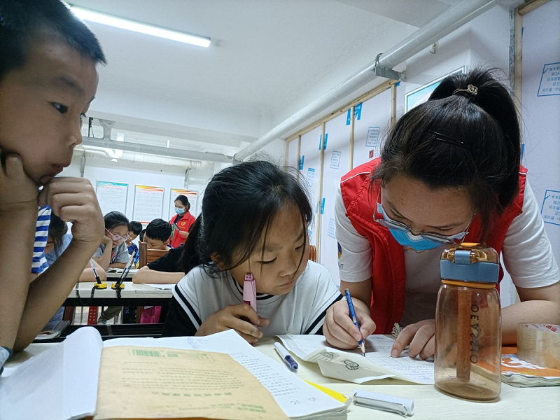 志愿者们到达目的地后,小朋友们也如约而至,他们礼貌地与志愿者老师们问好,现场一片温馨。课堂上,小朋友们安安静静地在座位上书写自己的作业,当遇到不理解的问题时,小朋友间会主动互相帮助;志愿者们也很热情,在看到皱着眉头的小朋友时,便主动上前询问进行帮助,耐心地为小朋友们解答疑惑,为他们讲解习题并引导他们独立思考。课堂上,不仅仅有小朋友们写字的沙沙声,还有志愿者们轻声细语的讲解声,气氛非常和谐。
