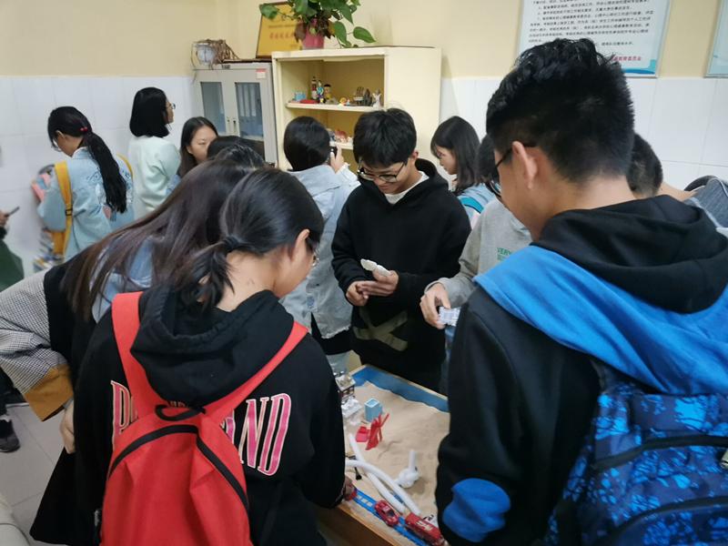 一盘细沙,一瓶清水,一架子各式各样的物件造型,加上辅导员老师的指导与帮助,同学们的自由表现与创造,这就构成了沙盘游戏最基本的要素。而就在这简易的设置中,内心的世界得以呈现,压力得到宣泄,紧张的情绪得到舒缓。活动中,同学们凭着自己的感觉和喜好在沙盘上搭建属于自己的王国,搭建完成后,他们相互讨论交流自己的想法,并对自己的不解提出疑问,二级心理工作站的辅导员老师也对其进行一一解答。