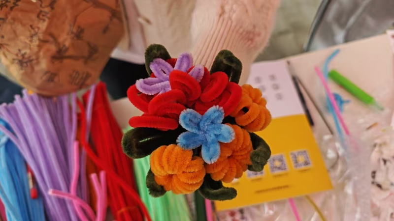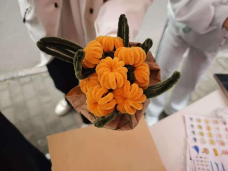 活动筹备阶段,心理部成员精心策划流程、采购全套材料,通过线上社群分享、线下宣传等多种形式广泛推广,吸引了众多同学踊跃报名参与。活动现场热闹非凡,五颜六色的扭扭棒整齐摆放,剪刀、胶水准备齐全。活动伊始,心理部志愿者化身“手工导师”,手持彩色扭扭棒,从基础绕圈、弯折技巧讲起,细致演示了花朵、钥匙扣等造型的制作步骤。“先将黄色扭扭棒对折绕成圆形,再用绿色扭扭棒做花茎,轻轻捏出叶子的弧度……”随着耐心地讲解,原本纤细的扭扭棒在志愿者手中渐渐有了形态,引得在场同学纷纷拿起材料,跃跃欲试。同学们专注的眼神里满是对创作的期待,有的同学选择制作小巧的郁金香,反复调整花瓣的角度,力求呈现最自然的绽放姿态;有的同学组队合作,一人负责塑形、一人搭配配色,共同完成了憨态可掬的小熊挂饰。过程中,遇到造型难题时,大家主动交流技巧;看到同伴的创意作品时,彼此真诚夸赞,活动现场满是欢声笑语,温暖的氛围悄然治愈着每一颗心灵。