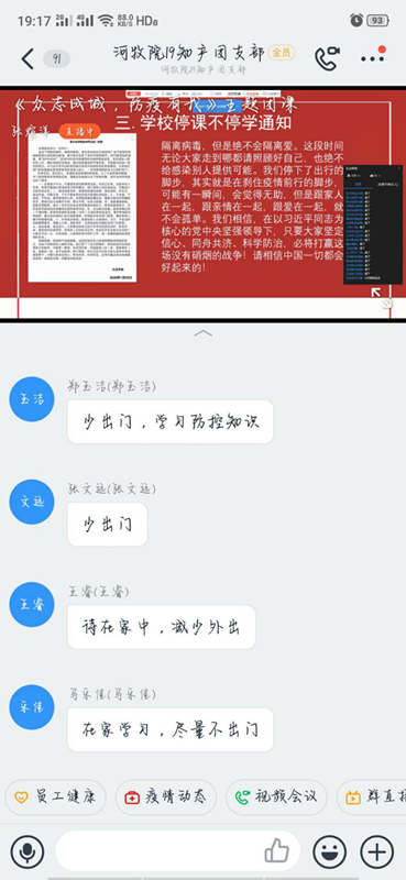 团课上,各班主持人利用线上平台与同学们分享了新型冠状病毒的症状、如何防护等问题,要求同学们提高防护意识,保持良好心态,不造谣、不信谣、不传谣,用实际行动维护大局、服从大局,弘扬青春正能量。同时,主持人提醒同学们若出现发烧、咳嗽等症状要及时上报,积极治疗。