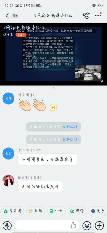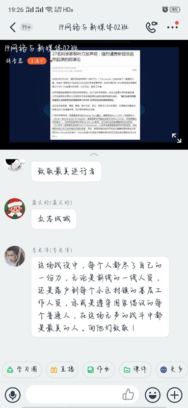 此次线上专题团课的开展,使同学们充分了解了疫情并能更好的加强防护。同学们纷纷表示,要弘扬正能量,为打赢这场疫情阻击战作出自己的贡献。