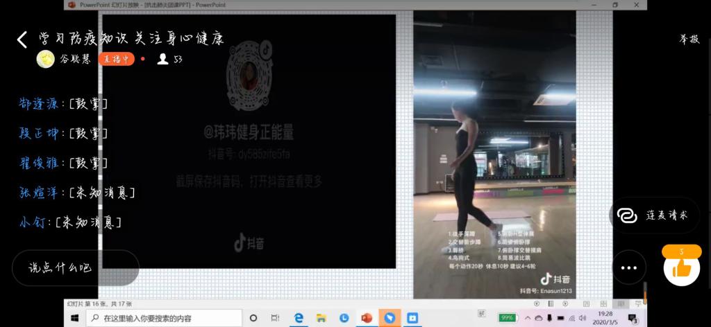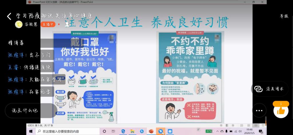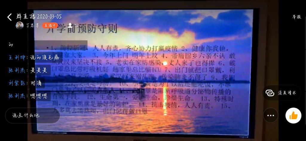 为响应公司健康防疫的号召,提升当代老员工的防护意识,2020年3月5日晚7时,英国上市365以班级为单位在“钉钉”直播平台开展了“学习防疫知识,关注身心健康”线上主题团课,19级全体员工参加。