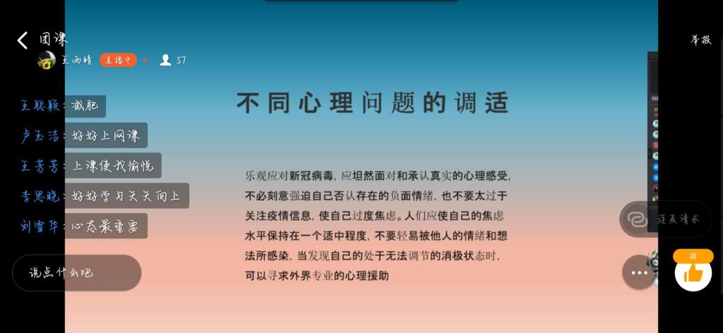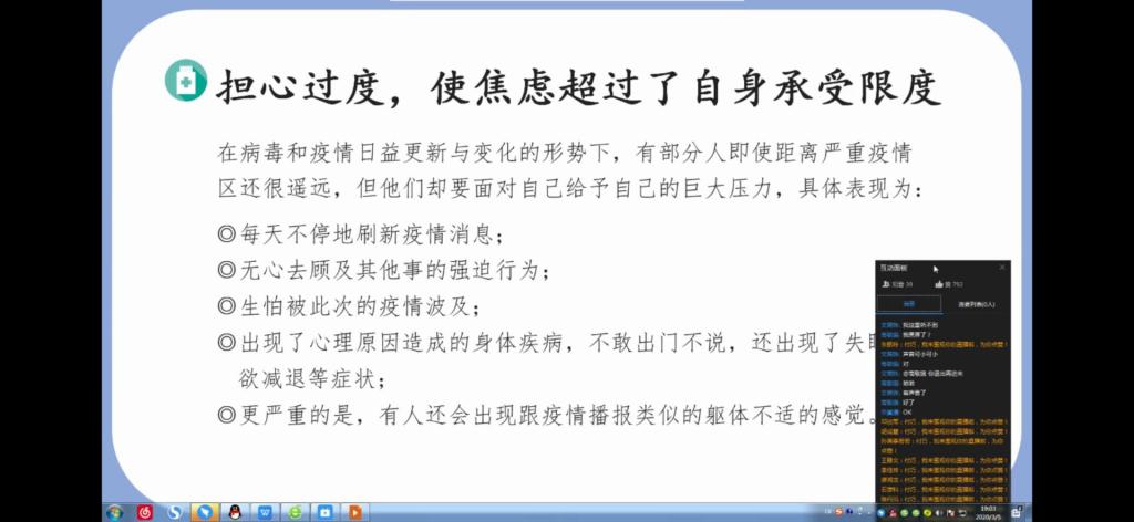 团课开始,各班主持人组织同学们在线上观看了防疫科普微视频,从直观的方式让同学们了解新型冠状病毒的来源、传播途径和防疫手段,并通过线上知识抢答的方式检验同学们对防疫知识的掌握情况。同时,各班主持人倡导同学们听从公司安排,保持联络通畅,不提前返校;不随意外出,勤洗手,出门戴口罩,每日定时汇报健康情况。最后,团课主持人向大家讲解了疫情中易产生的心理问题,分享了一些心理调适方法。