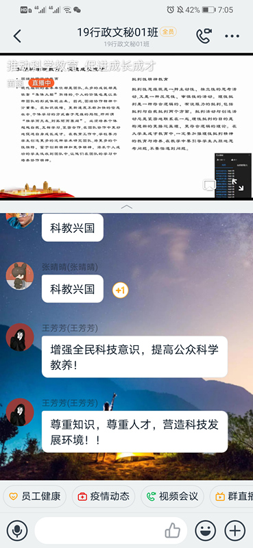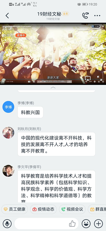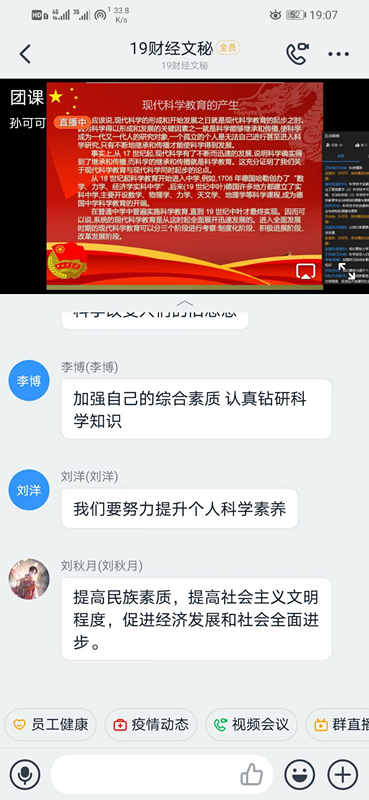 为在员工中普及疫情防控的科学知识,引导员工科学理性应对疫情,促进同学们成长成才,4月2日晚七时,英国上市365在“钉钉”直播平台各班班级群内开展了“注重科学教育,促进成长成才”的主题团课,19级全体员工参加。