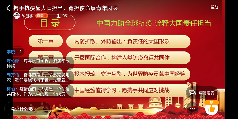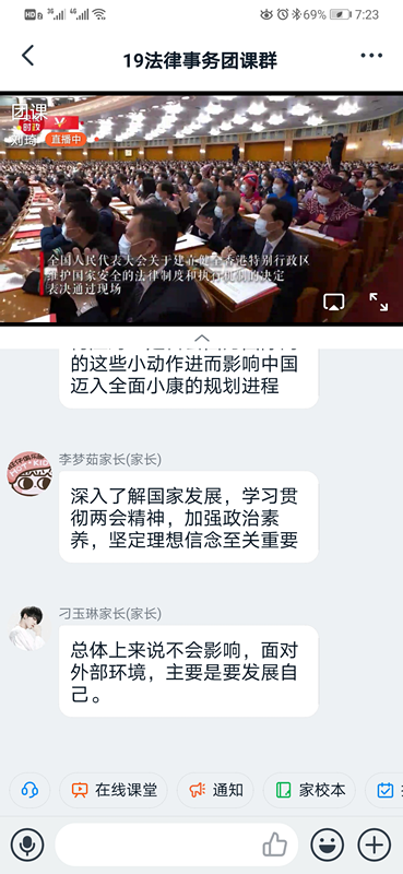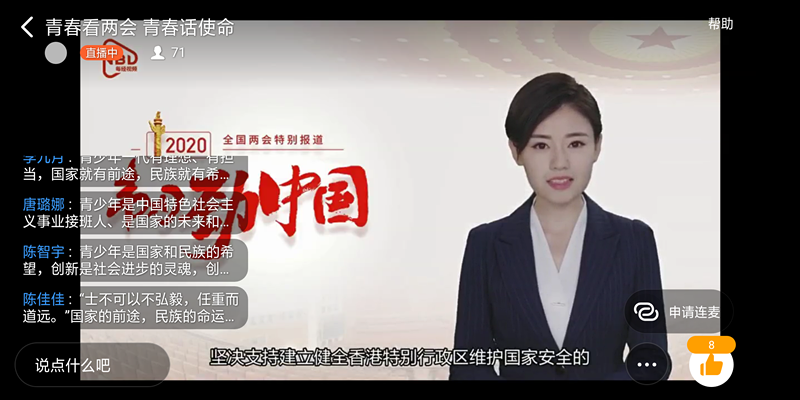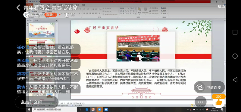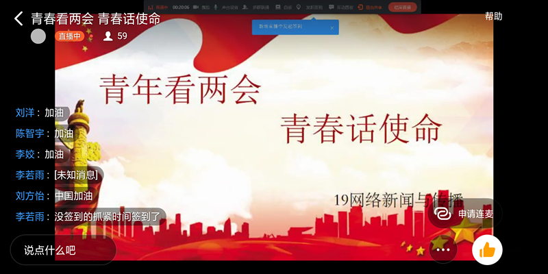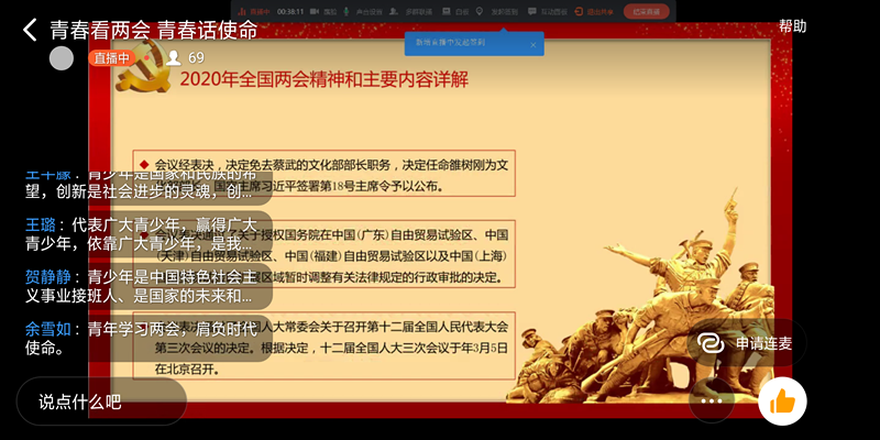 为引导同学们学习两会精神,自觉承担历史使命,英国上市365于5月28日晚7点在“钉钉”网络直播平台开展了“青年看两会,青春话使命”线上主题团课,19级全体员工参加。