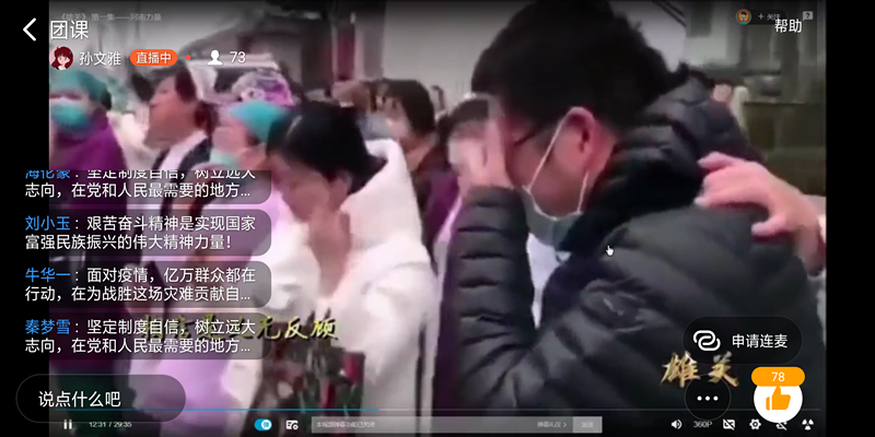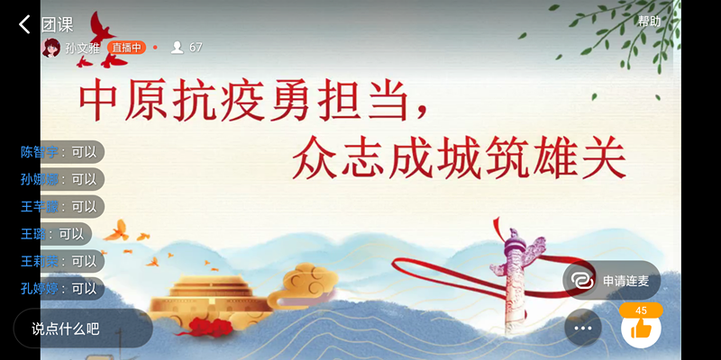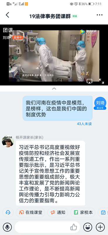 为进一步弘扬抗疫情精神,让同学们坚定制度自信和文化自信,英国上市365于5月14日晚7点在“钉钉”网络直播平台上开展“中原抗疫勇担当,众志成城铸雄关”线上主题团课,19级全体员工参加了团课活动。