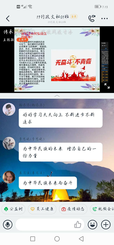 为弘扬五四精神,提高同学们的爱国热情,英国上市365于4月30日晚七点在“钉钉”网络直播平台上组织开展“传承五四精神、绽放战疫青春”网上主题团课。19级全体员工参加。