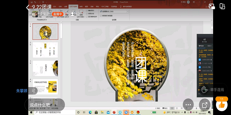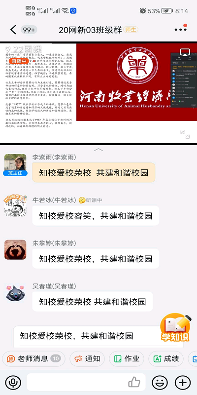 9月22日晚,20级员工在钉钉直播平台开展“知校爱校荣校,共建和谐校园”主题团课。在各班团支书的组织及主持人的带领下,同学们积极配合,圆满完成了本周的团课。