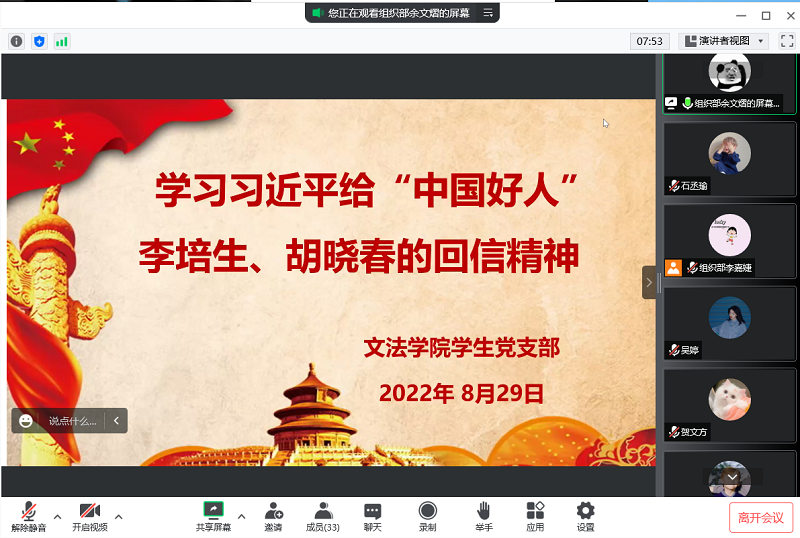 为提高员工党员的政治理论水平,加强员工党员的思想道德觉悟,英国上市365第一、第二党支部于8月29日通过腾讯会议组织开展关于认真学习习近平总书记给“中国好人”李培生、胡晓春回信精神的政治理论学习活动。会议由员工第一党支部书记付慧婕主持,全体员工党员参加。