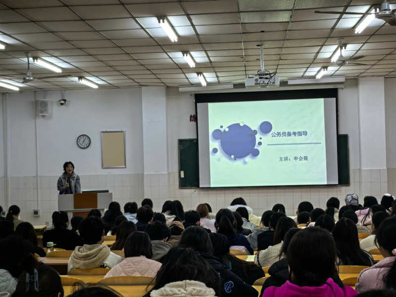 讲座上,主讲人申会霞老师凭借丰富的教学经验和对公务员考试的深入了解,从多个方面展开了精彩讲授。首先,申老师详细介绍了公务员考试的基本概况,包括考试种类、考试科目、考试时间以及招录政策等内容,让同学们对公务员考试有了一个全面且清晰的认识。